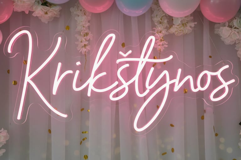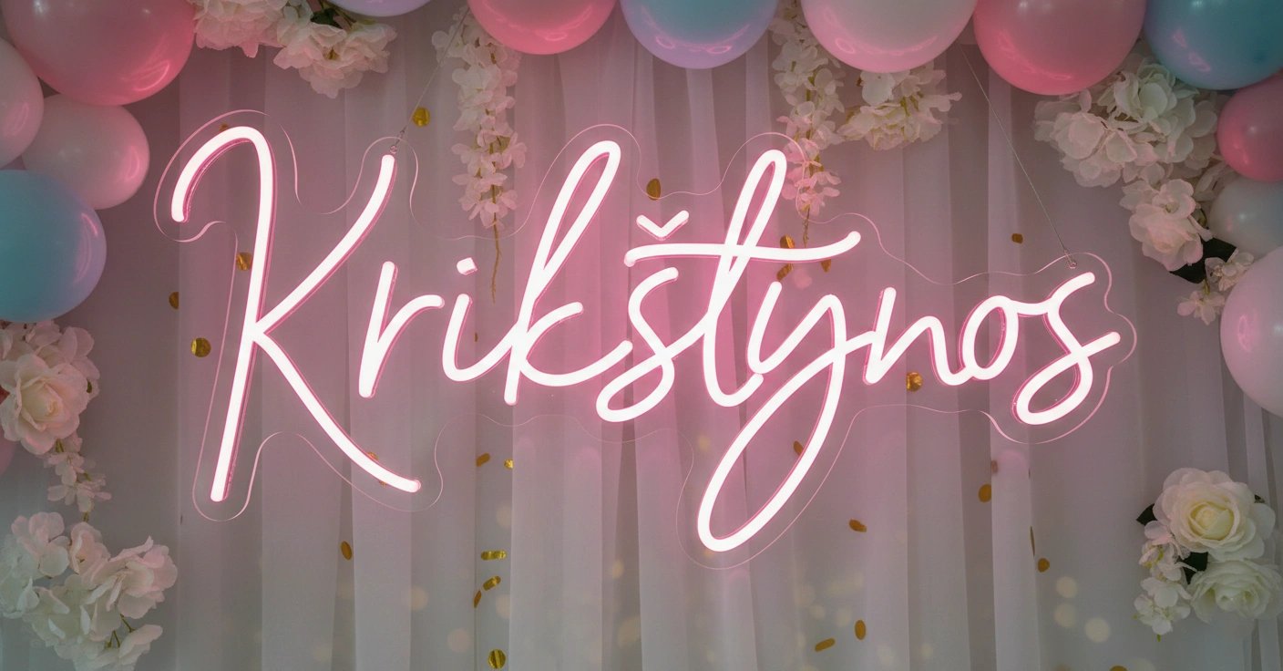 Neoninis užrašas „Krikštynos“ – stilinga detalė vaiko šventei. Tinka fotosienelei, šventės salei ar namų dekorui. Ryškus, LED apšvietimas kuria šiltą ir jaukią nuotaiką.